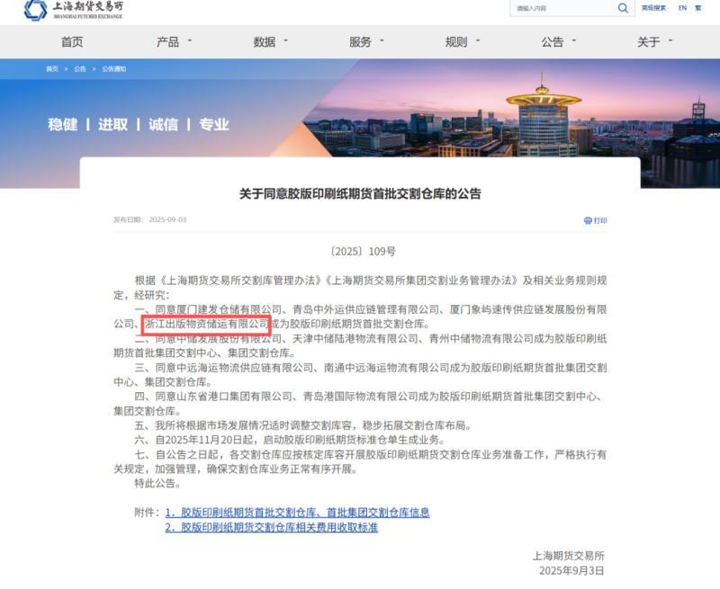 物资集团下属子公司浙江出版物资储运有限公司成功入选全国首批胶版印刷纸期货交割仓库名单,将正式为市场提供安全、优质、高效的专业化期货交割服务。